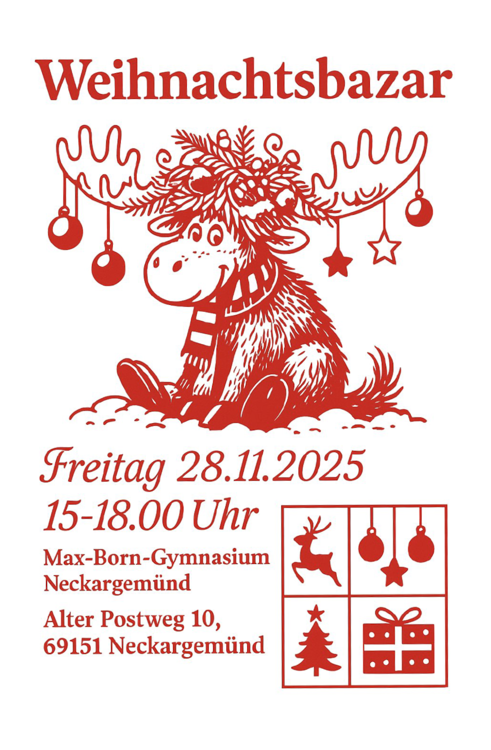 wir möchten auch in diesem Jahr die Adventszeit einläuten: Unser traditioneller Weihnachtsbazar findet am Freitag, den 28.November 2025, von 15 bis 18 Uhr im Schulgebäude statt.