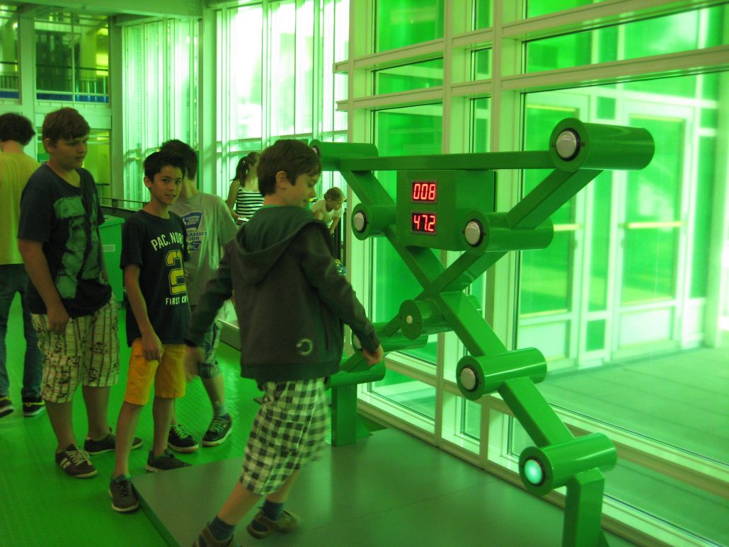 Am 16.07.13 mach­te die Klas­se 7a unter der Lei­tung von Frau Thier­ing und Frau Wiend­locha-Licht einen Aus­flug ins Tech­no­se­um nach Mann­heim. Das Tech­no­se­um umfasst drei Ele­men­ta-Berei­che mit zahl­rei­chen Aus­stel­lun­gen, wo die Besu­cher selbst expe­ri­men­tie­ren kön­nen. Die Aus­stel­lun­gen zei­gen 200 Jah­re Natur­wis­sen­schaf­ten, Tech­nik- und Sozi­al­ge­schich­te. Nach kur­zer Zug­fahrt und kur­zem Fuß­weg gelang­te die Klas­se 7a zum Tech­no­se­um. Dort wur­den Ein­tritts­kar­ten besorgt und die Ruck­sä­cke ver­staut. Dann ging es in Rich­tung Ele­men­ta 3, die voll­stän­dig in hell­grün gestal­tet war. Die Schü­ler wur­den dort zunächst von den Tech­no-Scouts ein­ge­wie­sen. Zusätz­lich beka­men sie von den Leh­rern ein paar Quizz-Auf­ga­ben zu den Sta­tio­nen. In die­ser Ele­men­ta ging es um Umwelt­be­wusst­sein, Com­pu­ter gegen Mensch und opti­sche und ande­re phy­si­sche Täu­schun­gen. Es gab Ver­su­che zu lösen, wie z.B. gegen einen Robo­ter-Müh­le zu spie­len, in 60 Sekun­den so viel wie mög­lich auf­blit­zen­de Tas­ten zu betä­ti­gen, von einer Erhö­hung zu sprin­gen und so weich wie mög­lich auf einer Metall Plat­te zu lan­den oder vor einer gestreif­ten Wand die sich beweg­te auf einem Bein ste­hen zu blei­ben. Nach­dem alle Auf­ga­ben been­det wor­den waren, hol­te die Klas­se ihre Ruck­sä­cke und fuhr mit dem Auf­zug in den Essens­be­reich. Danach gin­gen wir zur Ele­men­ta 1, die größ­ten Teils aus Holz und sehr mit­tel­al­ter­lich gestal­tet war. In die­ser Ele­men­ta ging es um Kraft­auf­wen­dung und ein­fa­che Maschi­nen. Hier beka­men die Schü­ler wie­der ein neu­es Arbeits-blatt, wel­ches gelöst wer­den konn­te. Die­ses Mal konn­te man Expe­ri­men­te machen, wie z.B. in einem gro­ßen Mau­se- Rad lau­fen und dadurch eine ca. 300 kg schwe­ren Stein anhe­ben, durch ein Röhr­chen Luft in einen Behäl­ter zu pus­ten, wodurch Flüs­sig­keit durch ein Rohr nach oben gedrückt wur­de oder mit ver­schie­de­nen Fla­schen­zü­gen einen 20 kg Mehl­sack hoch­he­ben. Wenn die Arbeits­blät­ter rich­tig gelöst wor­den waren, bekam man einen klei­nen Preis von der Leh­re­rin. Nach die­ser wun­der­schö­nen Ein­füh­rung in die Phy­sik ging es wie­der mit dem Zug Rich­tung Neckar­ge­münd. Es hat allen Schü­lern und auch sogar den Leh­re­rin­nen sehr gut gefal­len.