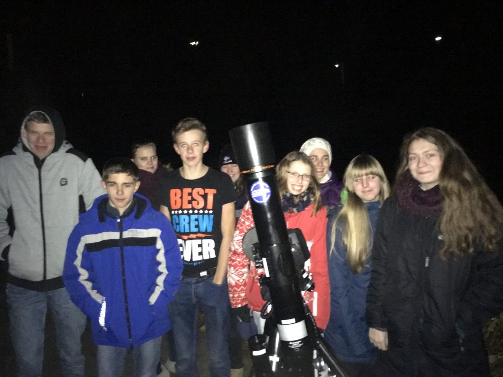 Der Sinn davon ist ganz ein­fach: Statt Theo­rie geht man jetzt in der Pra­xis beob­ach­ten. Frau Thier­ing hat­te dafür auf dem Park­platz der Schu­le ein fast men­schen­gro­ßes Tele­skop auf­ge­baut. Jeder aus der Grup­pe durf­te mal rein­schau­en. Wir konn­ten den Mars mit sei­ner leich­ten röt­li­chen Fär­bung und den Saturn mit sei­nen ange­deu­te­ten Rin­gen beob­ach­ten. Dann hat jeder einen Feld­ste­cher bekom­men, um so Ster­ne zu beob­ach­ten. Frau Thier­ing hat­te uns hier­zu eine klei­ne Ein­wei­sung gege­ben und uns dann ein paar wich­ti­ge astro­no­mi­sche Objek­te und Ster­ne gezeigt.