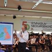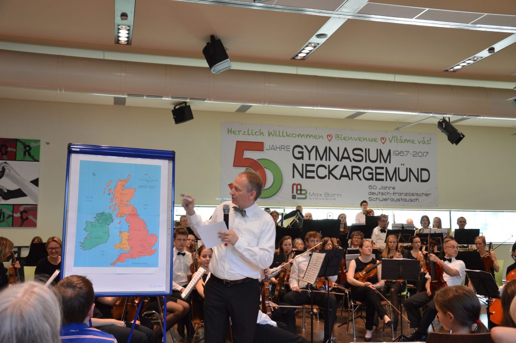„Wir haben eine große Reise vor“, kündigte René Schuh, Leiter und Dirigent der Musikfreunde Heidelberg und Direktor der Bundesakademie für musikalische Jugendbildung in Trossingen, am 4. Juli zu Beginn des Konzerts der Musikfreunde Heidelberg am Max-Born-Gymnasium an. Anhand einer Landkarte führte er das Publikum – die Aula des MBG war bis zum letzten Stuhl gefüllt – an entlegene Orte kreuz und quer durch Großbritannien. Mit vielen Kuriositäten über Land und Leute wusste er das Publikum zu unterhalten und die Landschaften lebendig werden zu lassen. Ein unglaublich vielseitiges und spannendes Konzert wurde präsentiert: Wellenrauschen, pfeifende Stürme und feierliche Fanfaren waren in Mendelson-Bartholdys „Hebriden Ouvertüre“ zu hören. Die wunderschönen Landschaften Schottlands wurden in „The Land of the Mountain and the Flood“ von Harnish MacCunn lebendig.