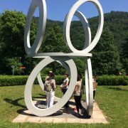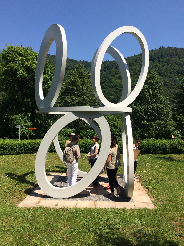 „Betrachten Sie die Skulptur bitte von allen Seiten. Was fällt Ihnen auf? Von welcher Seite gefällt Ihnen die Skulptur am besten? Warum? Wie fühlt sich das Material an? Wie wirken die Farben auf Sie? Welchen Namen würden Sie der Skulptur geben?“ Fragen dieser Art stellten die Schülerinnen und Schüler der Kunst-AG ihren Gästen im Skulpturenpark der Orthopädischen Klinik in Heidelberg Schlierbach am 22. Juli 2017.