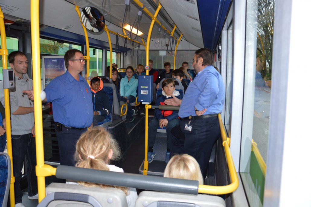 Es war total toll, was wir alles rund um das The­ma Bus erfah­ren haben. Am span­nends­ten waren die Gefah­ren­si­tua­tio­nen. Wir haben gelernt, wie wir uns dann ver­hal­ten müs­sen.“, mein­te Oli­via aus der Klas­se 5a. Mit viel Humor und guter Lau­ne gaben Uwe Blüm­ler, Hel­mut Spatz und die bei­den Aus­zu­bil­den­den Mar­cel Greu­lich und Mario Kikic allen Schü­le­rin­nen und Schü­lern der fünf­ten Klas­sen in jeweils zwei Schul­stun­den am 4. und 5. Okto­ber 2017 eine Ori­en­tie­rungs­hil­fe für das siche­re Ver­hal­ten an der Bus­hal­te­stel­le, im Bus, in Gefah­ren­si­tua­tio­nen und das sozia­le Ver­hal­ten im Bus. „Wir alle wol­len eine ange­neh­me Fahrt im Bus haben und gut zu Hau­se ankom­men – dafür kön­nen wir auch selbst etwas tun“, erklär­te Hel­mut Spatz von der Bus­schu­le der RNV. Rück­sicht­nah­me auf ande­re Fahr­gäs­te, kein Essen und Trin­ken, beson­ne­nes Ver­hal­ten in Not­si­tua­tio­nen – all das gehört dazu.