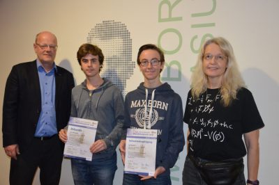 Sie haben es gewagt und sie waren unglaub­lich flei­ßig: Jan Brauch, Jan Zwersch­ke, Jurek Thie­mig und Simon Pal­mer, MBG-Schü­ler der Kurs­stu­fe 1 und 2 haben in den Som­mer­fe­ri­en zwei Wochen lang über äußerst kniff­li­gen Phy­sik­auf­ga­ben gebrü­tet. Es galt, beson­de­re Phä­no­me­ne in der Phy­sik aus ver­schie­de­nen Per­spek­ti­ven zu beleuch­ten und mög­lichst ele­gan­te Lösungs­an­sät­ze zu fin­den. Ver­netz­tes Den­ken, Krea­ti­vi­tät und vor allem gute phy­si­ka­li­sche Kennt­nis­se waren nötig, um die ers­te Run­de des bun­des­wei­ten Qua­li­fi­ka­ti­ons­ver­fah­rens für die Inter­na­tio­na­le Phy­sik­olym­pia­de zu bestehen. Jan Zwersch­ke und Simon Pal­mer haben es geschafft. Sie dür­fen nun auch an der zwei­ten Qua­li­fi­ka­ti­ons­run­de teil­neh­men. Jan Zwersch­ke berich­te­te: „Am span­nends­ten fand ich eine Auf­ga­be, in der es um das Berech­nen von Licht­strah­len, die in ein Was­ser­glas schei­nen, geht. Der Bre­chungs­in­dex muss­te her­aus­ge­fun­den wer­den.“