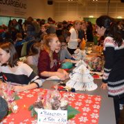 Mit weih­nacht­li­chem Gesang stimm­ten die neu­en Fünft­kläss­ler die Gäs­te auf die Advents­zeit ein: „Hörst du‘s rascheln oder knis­tern und geheim­nis­voll noch flüs­tern… Na-na! A-ha! Jetzt ist Weih­nach­ten schon ganz nah!“, ein Weih­nachts­lied von Rolf Kren­zer, sowie „Win­ter rose“ von Matt Devitt. Anschlie­ßend wur­den die Schü­le­rin­nen und Schü­ler zu flei­ßi­gen Ver­käu­fern: sie prie­sen hüb­sche Vogel­fut­ter­häus­chen aus Kaf­fee­tas­sen, selbst her­ge­stell­te Gewürz­mi­schun­gen wie Glüh­wein­ge­würz, Ros­ma­rin­salz, Chi­li­salz und Brat­ap­fel­ge­würz in hüb­schen Fläsch­chen, Christ­mas Cra­cker, Wal­dorf­leuch­ten, Tas­sen­scho­ko­la­de, eine klei­ne Aus­zeit in einer Tüte, Bade­salz­bom­ben, Lese­zei­chen, Weih­nachts­kar­ten, Brot­tü­ten­ster­ne, Bie­nen­wachs­ker­zen, selbst gestal­te­te Later­nen aus Glas, Weih­nachts­bäu­me aus alten Buch­sei­ten und vie­les mehr. Die älte­ren Schü­ler küm­mer­ten sich um das leib­li­che Wohl mit Cre­pes, Waf­feln, hei­ßer Scho­ko­la­de, Kin­der­punsch und hei­ßer Capri-Sun.