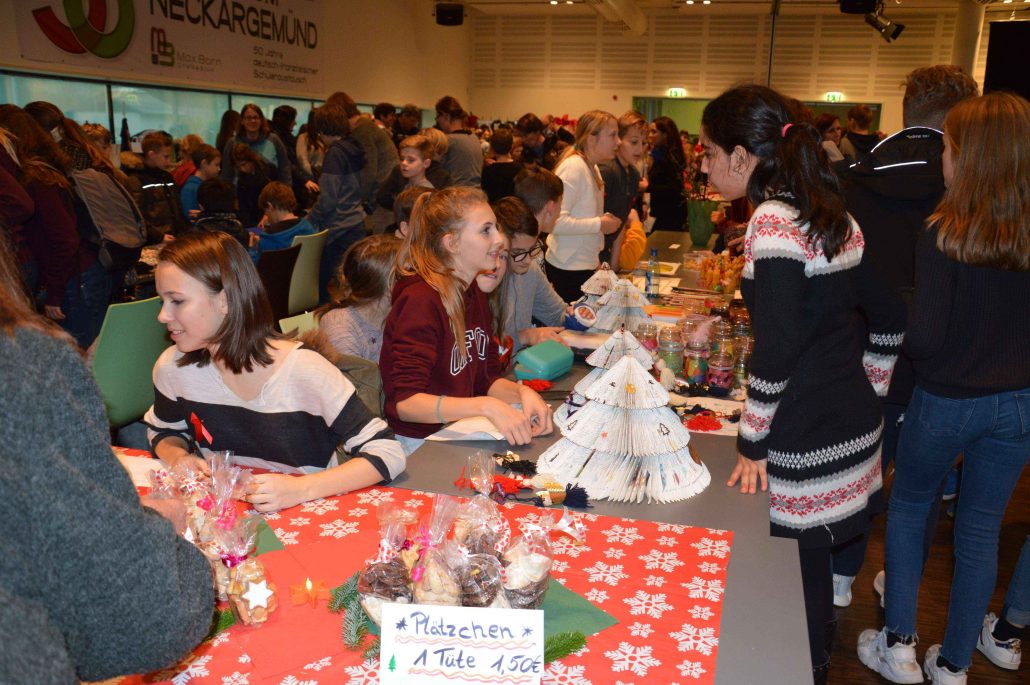 Mit weih­nacht­li­chem Gesang stimm­ten die neu­en Fünft­kläss­ler die Gäs­te auf die Advents­zeit ein: „Hörst du‘s rascheln oder knis­tern und geheim­nis­voll noch flüs­tern… Na-na! A-ha! Jetzt ist Weih­nach­ten schon ganz nah!“, ein Weih­nachts­lied von Rolf Kren­zer, sowie „Win­ter rose“ von Matt Devitt. Anschlie­ßend wur­den die Schü­le­rin­nen und Schü­ler zu flei­ßi­gen Ver­käu­fern: sie prie­sen hüb­sche Vogel­fut­ter­häus­chen aus Kaf­fee­tas­sen, selbst her­ge­stell­te Gewürz­mi­schun­gen wie Glüh­wein­ge­würz, Ros­ma­rin­salz, Chi­li­salz und Brat­ap­fel­ge­würz in hüb­schen Fläsch­chen, Christ­mas Cra­cker, Wal­dorf­leuch­ten, Tas­sen­scho­ko­la­de, eine klei­ne Aus­zeit in einer Tüte, Bade­salz­bom­ben, Lese­zei­chen, Weih­nachts­kar­ten, Brot­tü­ten­ster­ne, Bie­nen­wachs­ker­zen, selbst gestal­te­te Later­nen aus Glas, Weih­nachts­bäu­me aus alten Buch­sei­ten und vie­les mehr. Die älte­ren Schü­ler küm­mer­ten sich um das leib­li­che Wohl mit Cre­pes, Waf­feln, hei­ßer Scho­ko­la­de, Kin­der­punsch und hei­ßer Capri-Sun.
