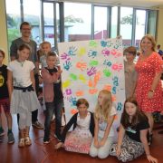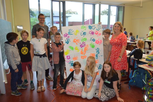 Gemein­sam mit den Klas­sen­leh­rer­teams und den Paten ver­brach­ten die Fünft­kläss­ler bereits eine Schul­stun­de in ihrem neu­en Klas­sen­zim­mer. Dort konn­ten sie sich gegen­sei­tig ken­nen ler­nen und eine gemein­sa­me Hand­ab­druck-Akti­on durch­füh­ren.