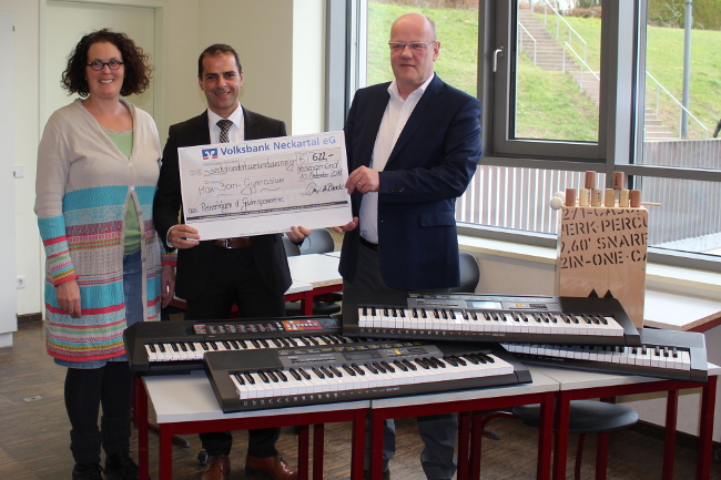 Christian Rupp, Vertriebsleiter Filialkunden der Volksbank Neckartal und seine Kollegin Evelyn Schneider waren gekommen, um sich die neue Anschaffung des MBG anzusehen, die durch Mittel aus dem Gewinnsparverein e.V. ermöglicht worden war. „Gemäß dem Motto von Friedrich Wilhelm Raiffeisen Was einer nicht schafft, vermögen viele, können nun viele Kinder gemeinsam Musik machen, was den Klassenzusammenhalt fördert“, freute sich Rupp. Besonders technikaffine Schüler fühlen sich von den Keyboards angesprochen. Schulleiter Joachim Philipp begrüßte es, dass musiktheoretische Bildungsinhalte nun ganz einfach in die Praxis umgesetzt werden können.