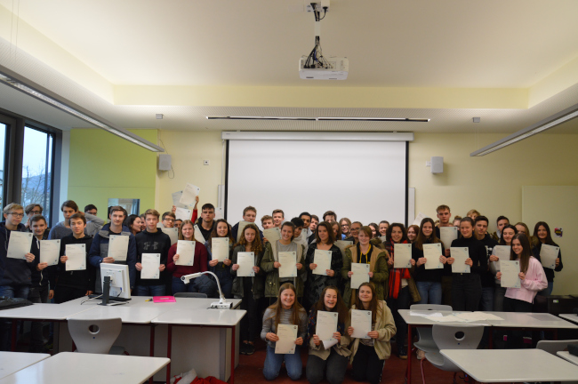 „Ich bin froh, dass ich an der Prüfung teilgenommen habe. So konnte ich mal in die Welt des Business Englisch hineinschnuppern. Das macht sich gut im Lebenslauf“, meinte Sarah Grabenbauer, die gemeinsam mit Lisa-Marie Kohl und Franziska Böhm die besten Ergebnisse der Jahrgangsstufe 10 am MBG in der Prüfung English for Business erzielt hat. 76 Zehntklässlerinnen und Zehntklässler hatten sich im Dezember der Prüfung English for Business Level 1 der Londoner Industrie- und Handelskammer (London Chambers of Commerce and Industry) gestellt. Es galt Memos und Briefe zu verfassen, Aussagen über Firmenbeschreibungen zu verifizieren, Tabellen auszulesen und Events im zeitlichen Ablauf zu planen. Die Schüler hatten sich von September bis Dezember in einer Arbeitsgemeinschaft auf die Prüfung vorbereitet. Das zusätzliche Engagement hat sich gelohnt – alle 76 Teilnehmer haben bestanden, 47 von ihnen sogar mit „distinction“ – mit Auszeichnung. Im zweiten Halbjahr haben die Schülerinnen und Schüler die Möglichkeit, an Level 2 teilzunehmen.