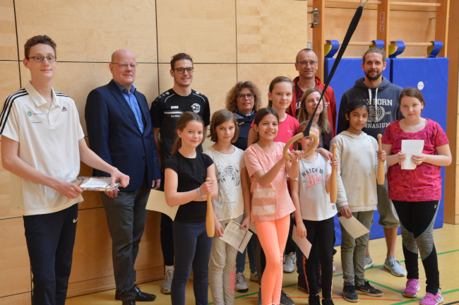 Schulleiter Joachim Philipp lobte das Engagement der Sportfachschaft unter der Leitung von Patrick Helten, die das Spielefest seit vielen Jahren perfekt organisiert und mit Hilfe von Neunt- und Zehntklässlern durchführt. Dadurch wird den Viertklässlern der Übergang an die weiterführende Schule erleichtert. Das Spielefest ist ein richtiges Großevent: innerhalb von vier Schulstunden werden ca. 230 Schüler in zwei getrennten Durchgängen durch 20 Sport- und Spielaktionen geleitet, das erfordert eine gute Struktur und gezielte Anleitung.