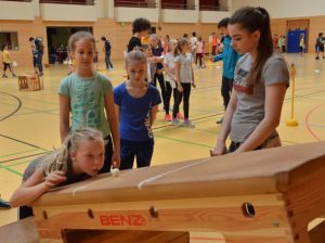 Markus und Elias aus der 5b des MBG sind schon „alte Hasen“ und kennen sich in der Sporthalle bestens aus, aber sie finden die verschiedenen Stationen trotzdem noch spannend: besonders das Tarzanschwingen und Tennis.