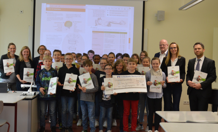 Andreas Stahl, Geschäftsstellenleiter der Filiale Münzenbach von der Volksbank Neckartal überreichte einen symbolischen Scheck über 632€. Er war begeistert von dem Heft: „Mir ist gleich aufgefallen, wie systematisch das Thema aufbereitet wurde. Der Blick wird auf das Wesentliche gerichtet. Die Schüler werden sicher sehr von der Arbeit mit dem Heft profitieren.“