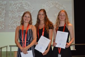 Barbara Laufs, Leiterin der Theater-AG, ehrte ihre engagierten Schauspieler/innen Zora Kropp, Jasmin Al-Hadjadj und Jakob Ruch.