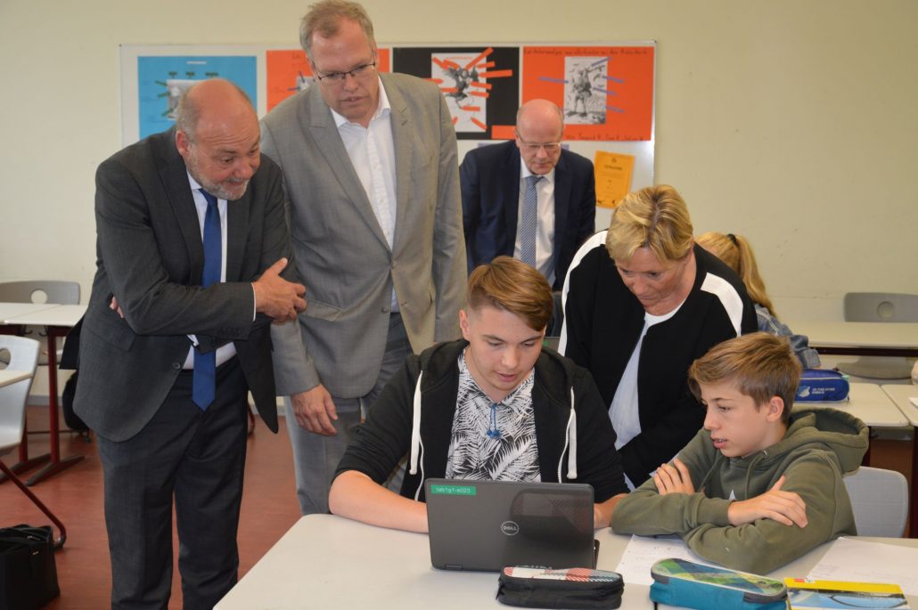 Dr. Susanne Eisenmann konnte im Klassenzimmer mitverfolgen, wie die Schüler an Erklärvideos arbeiteten, diese in die schuleigene Cloud stellten und auch zum Teil vorführten. In der Arbeitsphase nahm die Kultusministerin auch direkt Kontakt mit den Schülerinnen und Schülern auf und ließ sich von ihnen die Vor- und Nachteile des Tabletprojekts erläutern. Eine Schülerin aus der 8a sagte: „Am liebsten würden wir das Tablet in allen Unterrichtsfächern verwenden. Am besten klappt es bereits in Mathematik und den Naturwissenschaften, aber auch in Englisch arbeiten wir mit den Tablets.“