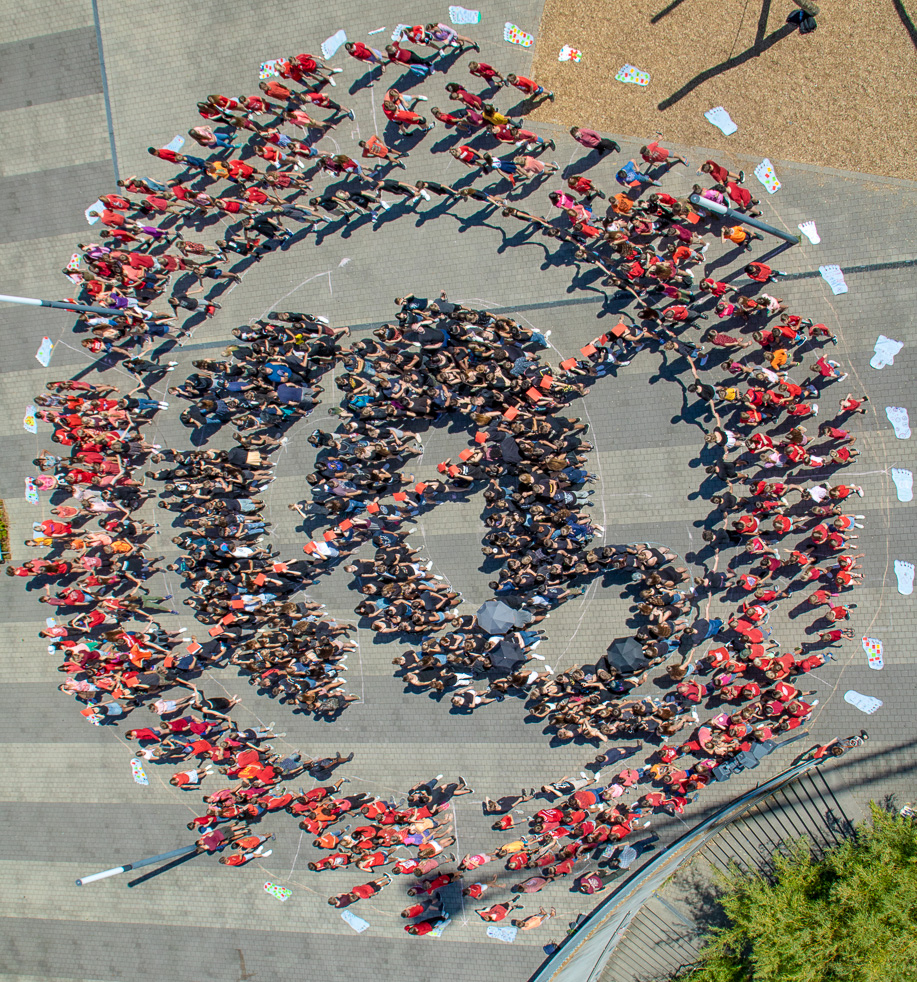 Die Schüler der Kursstufe 1 durften zum Abschluss den Landtagsabgeordneten Hermino Katzenstein über die aktuellen Klimaschutzziele der Landesregierung befragen, bevor es auf den Schulhof ging: dort wurde ein durchgestrichenes CO2-Zeichen nachgestellt.