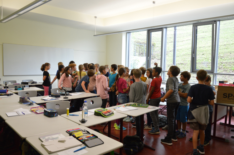 Nachdem auch Schulradler und Busmentoren den Kindern ihre Unterstützung zugesagt hatten, kam der wichtigste Teil für die neuen MBG’ler: Die Klassenlehrerteams verlasen die Namen der neuen Schülerinnen und Schüler, die dann gemeinsam mit ihren Paten aus den 10. Klassen zur ersten Willkommensstunde in ihre Klassenzimmer gingen.