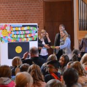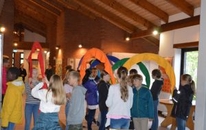 Zur Verdeutlichung, dass jedes der Kinder ein wichtiger Teil der „Fünfte-Klasse-Gemeinschaft“ ist, durfte dann jedes Kind auf einen Papierkreis Namen und Klasse notieren, und diese Kreise wurden dann zu einer beeindruckend überdimensionalen Papier-Raupe mit über 100 Raupengliedern zusammengefügt, die sich über das große Papp-Plakat schlängelt. Dieses Plakat, ergänzt um eine Blume mit den Namen der Religions-Lehrkräfte, wird in der Schule aufgehängt und soll die Fünftklässler daran erinnern, dass sie in diesem aufregenden ersten Schuljahr nicht allein sind, sondern in einem Team aus über 100 anderen Kindern.