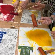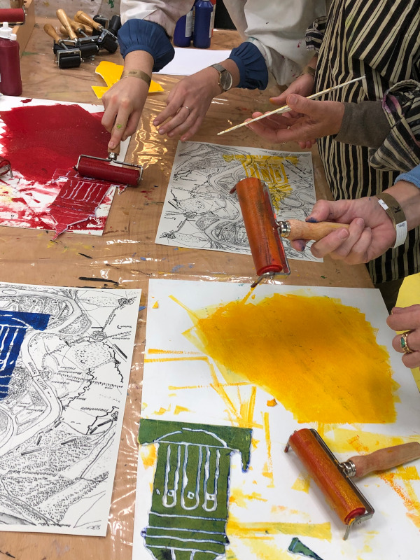 2019 wurde das Programm von der Kunstfachschaft in hervorragender Weise ausgearbeitet. Mit der S-Bahn ging es am 27. 9. nach Mannheim zur Kunsthalle. Frisch gestärkt vom Mittagessen im Luxx war das erste Highlight des Tages eine praktische Aufgabe: Lehrkräfte aller Fachbereiche, von denen manche seit Jahren keinen Farb-Pinsel mehr in der Hand gehalten hatten, waren aufgefordert, eine Vorlage des Mannheimer Wasserturms (oder auch ganz eigene Ideen) auf einen Mannheimer Stadtplan zu drucken. Mit dem Einritzen des Motivs in Styrene-Platten erarbeitete jeder eine Hochdruck-Vorlage – und unter Hochdruck ging es denn auch ans Werk, gemäß der kundigen Anleitung von Elisabeth Roth und Carolin Fröhling.