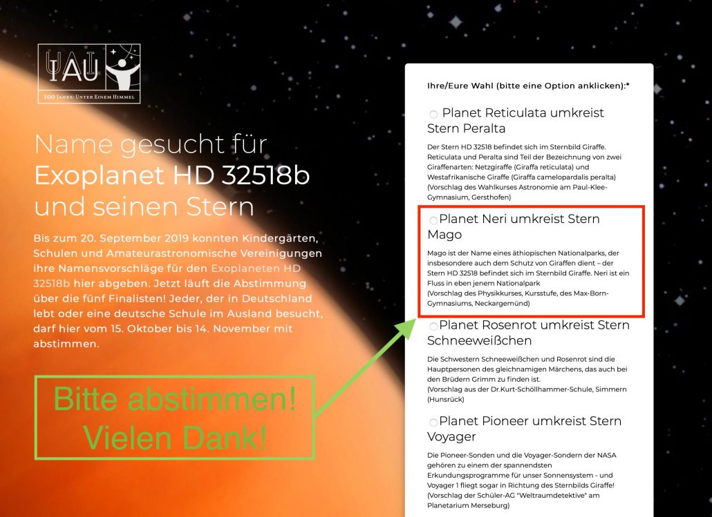 Jetzt wird auf jeden Fall ein Planet einen Namen aus Deutschland erhalten: Es geht um den Stern mit der Katalognummer HD 32518 und den ihn umkreisenden Exoplaneten HD 32518b, im Sternbild Giraffe, unweit des Polarsterns. Schulklassen, Kindergartengruppen und Amateurastronomische Vereinigungen waren aufgerufen, sich passende Namen auszudenken und Vorschläge einzureichen. Eine Expertenkommission wählte daraus die fünf Finalisten aus.