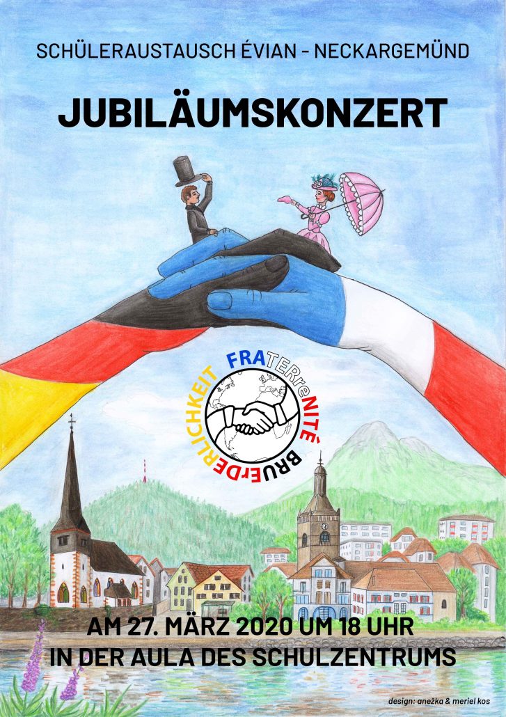 Der Schüleraustausch Évian-Neckargemünd lädt herzlich ein zum Jubiläumskonzert der Städtepartnerschaft am 27. März 2020 um 18 Uhr in der Aula des Schulzentrums.