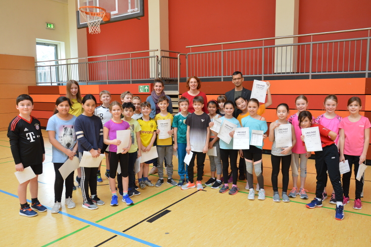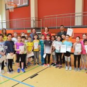 In der Halle hatten zu diesem Zeitpunkt bereits zwei vierte und zwei fünfte Klassen die 20 Spiel-, Spaß- und Sport-Stationen absolviert: Golfbälle eingelocht, Medizinbälle im Krebsgang transportiert und Tischtennisbälle über Hindernisse gepustet. Aruja aus der 4b war dabei besonders erfolgreich bei der Pedalo-Station: „Das kannte ich schon, und es ist lustig, darauf zu fahren.“ Yarah aus der 4c hatte besonders Spaß am Tarzan-Seil, an dem man frei schwingend Medizinbälle von der Bank kicken sollte. „Am Anfang war ich noch richtig schüchtern, aber jetzt fühle ich mich schon richtig wohl!“ Alonzo aus der 5a kommentiert: „Letztes Jahr habe ich das noch nicht so gut hingekriegt, aber diesmal konnte ich meine Leistung verbessern und habe gleich beim ersten Versuch alle Medizinbälle erwischt!“