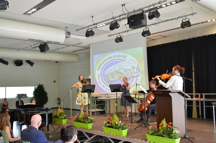 Für stimmungsvolle musikalische Begleitung sorgte ein Streichensemble mit den Lehrerinnen Julia Ruch und Isabelle Nikolajewicz, der Abiturientin Hannah Crooker und dem Zehntklässler Johannes Schips, ergänzt durch einen virtuellen Chor aus Abiturient*innen und Lehrpersonen, der von Julia Ruch aufwändig zusammengestellt worden war, sowie beim Abschluss-Stück mit Sabine Krings am Flügel.