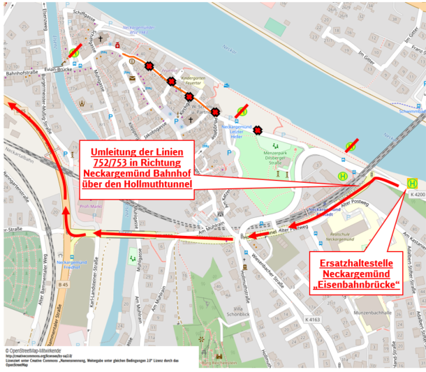 vom 06.10. bis 08.10. 2021 ist die Neckar­stra­ße auf­grund von Bau­ar­bei­ten voll gesperrt. Der Ver­kehr wird durch den Tun­nel umge­lei­tet, das betrifft auch die Bus­li­ni­en 752/753. Eine Ersatz­hal­te­stel­le vor der Eisen­bahn­brü­cke wird ein­ge­rich­tet.