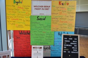 1. Session: Studien- und Ausbildungsbotschafter: zwei Studierende und zwei Auszubildende gaben spannende Einblicke in Studium und Ausbildung. Neben einem informativen Vortrag konnten die Schülerinnen und Schüler in Kleingruppen auch Fragen an die Studierenden und Auszubildenden stellen.