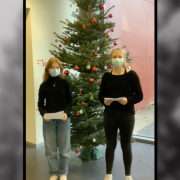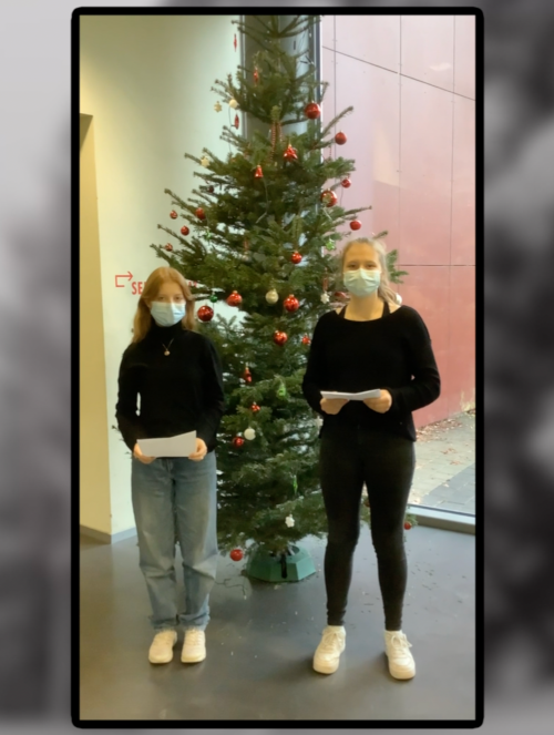 Die Performance von Elisa Amtsbüchler, Malin Haas, David Haspel und Raymond Kratz aus der 10b als „Familie Müller“ verkündete ebenso Hoffnung und Zuversicht: Familie Müller kann aus verschiedenen Gründen leider kein Weihnachtsfest feiern. Nach der ersten Enttäuschung der Kinder kommt die Familie am Weihnachtsabend durch das gemeinsame Brettspiel wieder zusammen und verbringt einen fröhlichen Abend miteinander – auch ohne Geschenke.