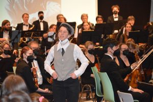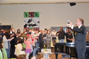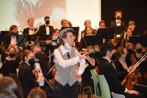 Nach der Pause zeigte René Schuh dem jungen Publikum eindrucksvoll: Für was braucht man eigentlich einen Dirigenten? In völligem Chaos spielte sein Sinfonieorchester ein paar ungeordnete Takte und das Publikum lachte. Im Anschluss übte Schuh mit dem Publikum das Dirigieren, was sichtlich Spaß machte.