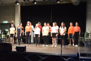 Gut gelaunt und zum Mitklatschen animierend trat am Schluss der Mittel- und Oberstufenchor auf und brachte mit „Sunny“ von Bobby Hepp und „Ex’s & Oh’s“ von Elle King richtig Stimmung ins Haus.