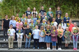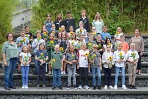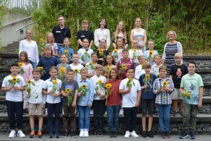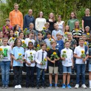 Im Anschluss wurden die Kinder jeweils von den Klassenlehrerteams auf die Bühne gerufen; jedes erhielt eine leuchtende Sonnenblume. Die 5a wurde von Annegret Ziegelmeyer und Birgit Jooss empfangen; Julia Ruch und Evelyn Staedel freuten sich auf die 5c; Katharina Stiefel und Klaus Oestreicher begrüßten die 5c und Ana Hartmann und Ellen Frey hießen die 5d willkommen. Alle Klassenlehrerteams wurden unterstützt von den Paten-Teams aus den 10. Klassen, die als Ansprechpartner und „große Kumpels“ den Fünftklässlern bei der Eingewöhnung in die neue Schule zur Seite stehen.