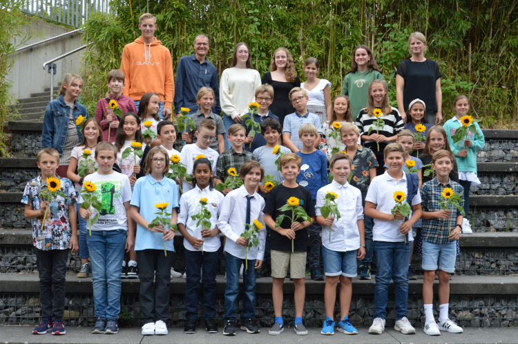Im Anschluss wurden die Kinder jeweils von den Klassenlehrerteams auf die Bühne gerufen; jedes erhielt eine leuchtende Sonnenblume. Die 5a wurde von Annegret Ziegelmeyer und Birgit Jooss empfangen; Julia Ruch und Evelyn Staedel freuten sich auf die 5c; Katharina Stiefel und Klaus Oestreicher begrüßten die 5c und Ana Hartmann und Ellen Frey hießen die 5d willkommen. Alle Klassenlehrerteams wurden unterstützt von den Paten-Teams aus den 10. Klassen, die als Ansprechpartner und „große Kumpels“ den Fünftklässlern bei der Eingewöhnung in die neue Schule zur Seite stehen.