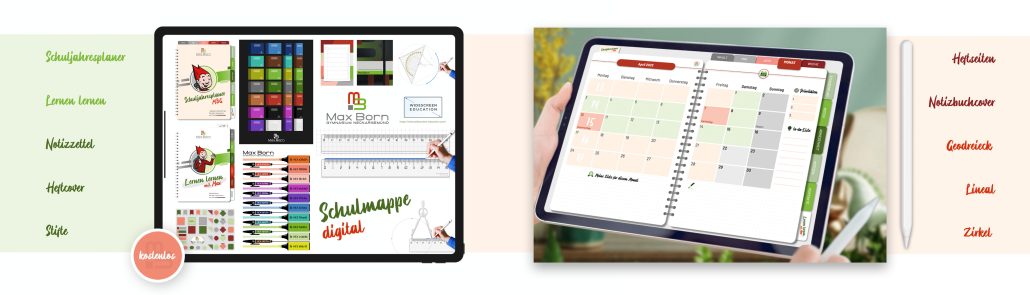 Dann unterstützt dich dabei ab sofort die kostenlose digitale Schulmappe des Max-Born-Gymnasiums! Diese beinhaltet alles, was du für deine MBG-Notizen benötigst, zudem exklusiv den neuen – über 400 Seiten umfassenden – digitalen Schuljahresplaner, das digitale Lernen lernen Heft sowie – dank Schullizenz – die digitalen Werkzeuge, wie Zirkel, Lineale und Geodreiecke von Widescreen Education. Die digitale Schulmappe kann unkompliziert in GoodNotes importiert und genutzt werden.