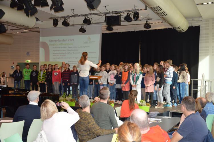 Gemeinsam fröhlich singend begrüßten die frischgebackenen Fünftklässer am Samstag, den 8. Oktober 2022 ihre Eltern in der Aula des Max-Born-Gymnasiums. Dort hatten sich die Eltern der Fünftklässler, die Paten der 5. Klassen und die Klassen- und Hauptfachlehrerinnen und -lehrer der Schulneulinge versammelt.