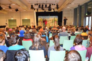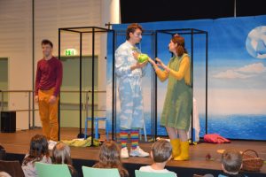 Im Anschluss sahen die Fünft- und Sechstklässler das Stück ‚The Empty Chair‘: Robbies Vater hat die Familie verlassen. Mit viel Aufwand und zeitlichen Strapazen bewältigen Robbie und seine Mutter seither den Alltag. Eines Tages landet ein Ufo im Garten. Ein eigenartiges, aber sehr nettes und einfühlsames Wesen klingelt an der Tür. Nach und nach lernen sich Robbies Mutter und das Alien namens Jared näher kennen und verlieben sich ineinander.