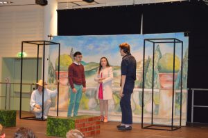 Zunächst sahen die Siebt- und Achtklässler das Stück ‚Two Gentlemen‘, eine moderne Version von Shakespeares ‚Two Gentlemen of Verona‘, die nur am Ende vom Original abweicht. Es geht um Freundschaft, Vertrauen, Liebe und Untreue – jedoch immer mit komödiantischem Unterton. Die Schülerschaft fand es amüsant, wie tollpatschig-überschwänglich sich die Internatsschüler Vincent und Piers abwechselnd sowohl in Julia als auch in Silvia verlieben, sich gegeneinander ausspielen und damit ihre eigene Freundschaft aufs Spiel setzen.