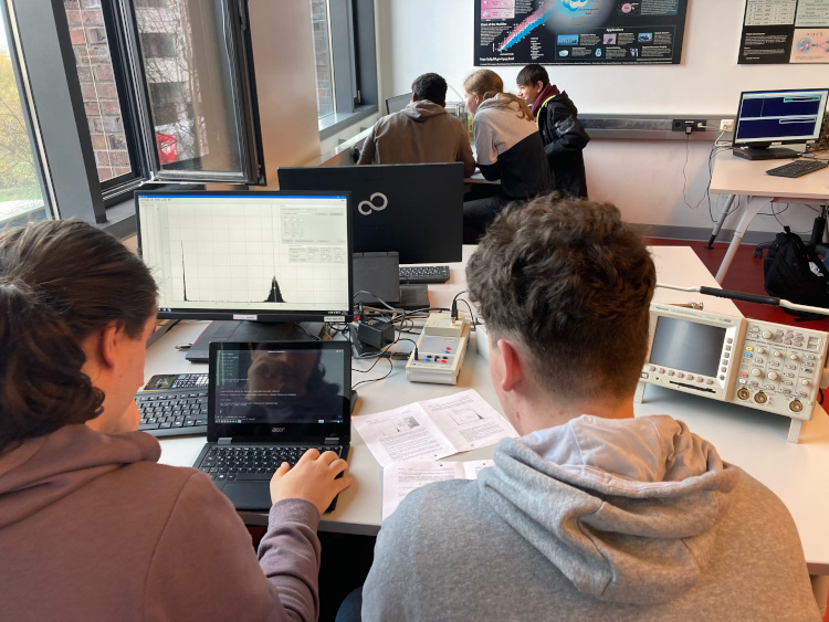 Im Vorfeld hatten wir uns in Gruppen auf verschiedene Experimente und deren Durchführung intensiv vorbereitet, sodass jede Gruppe mit ihrem Spezialgebiet loslegen konnte. Wir beschäftigten uns ausführlich mit Themen wie Ionisationskammer, Geigerzähler, Alpha-, Beta- und Gammaspektroskopie, Rutherfordstreuung oder Nebelkammer.