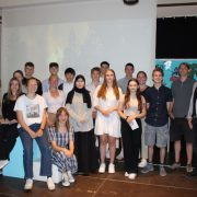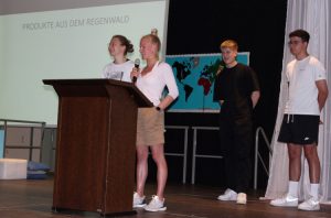 Dem tropischen Regenwald widmete sich die zweite Schülergruppe in ihrem Vortrag. Bis zu sechsmal mehr als heimische Wälder speichern tropische Regenwälder CO2. Das Abholzen und Abbrennen des Regenwaldes setzt den gespeicherten Kohlenstoff frei. Aber auch die Funktion des Regenwaldes als Wasserspeicher wird unterschätzt. Sein Abholzen – hauptsächlich um landwirtschaftliche Nutzung zu ermöglichen, löst eine Kettenreaktion von Dürre-Perioden, Waldbränden, Temperaturanstiegen und dem Ansteigen des Meeresspiegels aus.