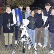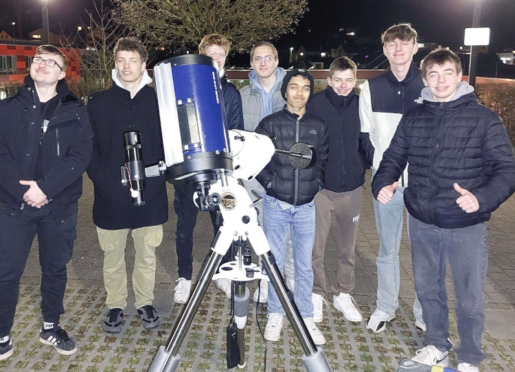 Der diesjährige Beobachtungsabend des Astronomiekurses der K1 bei Frau Dr. Thiering fand am 1. März statt. Treffpunkt war um 20:30 Uhr auf dem Lehrerparkplatz über der Schule. Nachdem alle eingetroffen waren und die Begrüßung abgeschlossen war, erhielten wir zuerst eine kurze Einführung in die Bedienung des Teleskops. Wir lernten, das Teleskop auszurichten und die Rektaszension und Deklination (quasi Länge und Breite) einzustellen. Dann erzählte Frau Dr. Thiering uns etwas über den mit bloßem Auge erkennbaren Orionnebel – er ist ein aktives Sternentstehungsgebiet. Diesen schauten wir uns dann noch genauer im Teleskop an. Danach arbeiteten wir mit Feldstechern (ugs.: Ferngläsern) und untersuchten mit ihnen verschiedene Himmelskörper. Der große Wagen, welcher Teil des Sternbildes „große Bärin“ ist, war unser nächstes Beobachtungsobjekt. Diesen kann man problemlos mit bloßem Auge erkennen. Er ist ganzjährig auf der Nordhalbkugel zu sehen, da er zirkumpolar ist. Mithilfe des großen Wagens kann man einfach den Nordstern (und somit die Richtung Norden) bestimmen. Hierfür nimmt man die Entfernung zwischen den Sternen Merak und Dubhe und verlängert diese fünf Mal. Des Weiteren schauten wir uns die Plejaden an – sie sind ein gerade einmal 100 Millionen Jahre junger offener Sternhaufen, welcher mit dem Feldstecher sehr schön anzuschauen ist. Zuletzt schauten wir uns Mars und den Mond an. Mars, der sog. „rote Planet“, war auch auf dem Teleskop rötlich zu erkennen. Den Mond sahen wir sehr genau, da er an diesem Tag sehr hell war. Die Schattengrenze (=Terminator) war sehr schön zu erkennen und auch die Krater waren deutlich mit zentraler Erhebung und Randgebirge zu sehen.