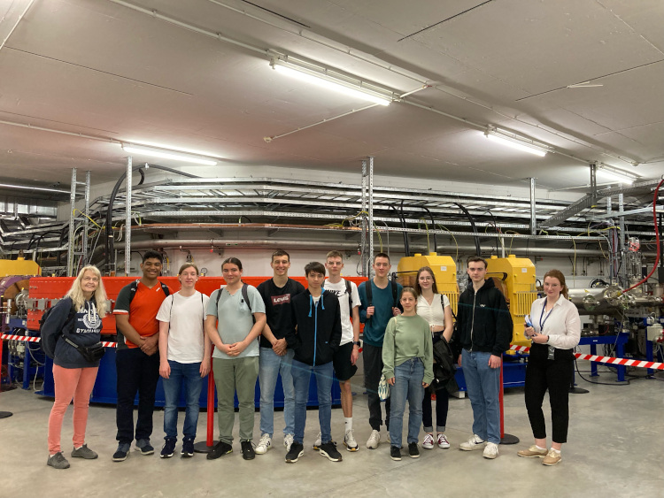Am 22.05.23 besuchte der 5stündig K2 Physikkurs mit seiner Lehrerin Frau Thiering das Ionentherapiezentrum HIT in Heidelberg. Frau Habbes, eine Physik-Doktorandin und freundliche Mitarbeiterin am HIT, empfing uns und informierte uns über die Anwendung der Ionentherapie zur Krebsbehandlung. Sie erklärte uns, dass es unterschiedliche Therapiezimmer gibt. In den normalen Behandlungszimmern tritt der Ionenstrahl aus einem festen Winkel aus der Wand aus, was die Behandlung mancher Tumore erschwert. Deshalb gibt es das „Gantry“-Behandlungszimmer, in dem der Ionenstrahl mithilfe eines 660 Tonnen schweren Metallgerüsts beliebig auf den Patienten ausgerichtet werden kann.
