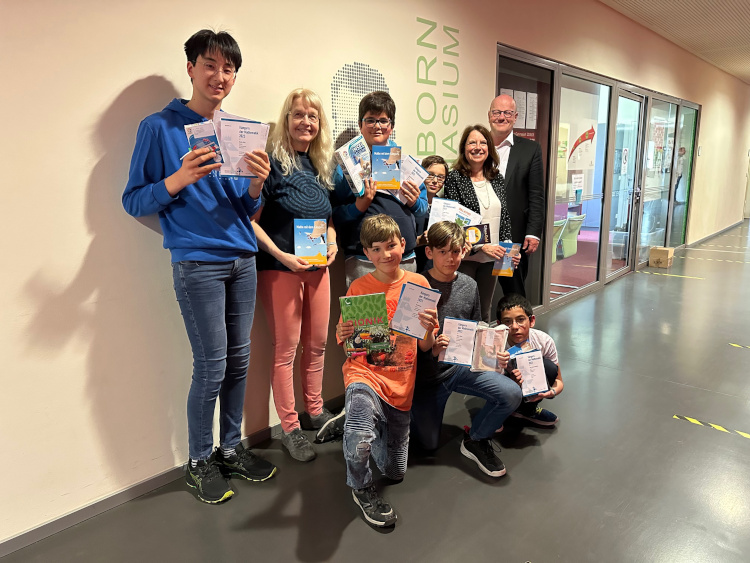 Bildunterschrift: Schulleiter J. Philipp(1.vr), die organisierenden Mathematiklehrrinnen I. Thiering (2.vl) und H. Steck (3.vr) mit den begeisterten PreisträgerInnen