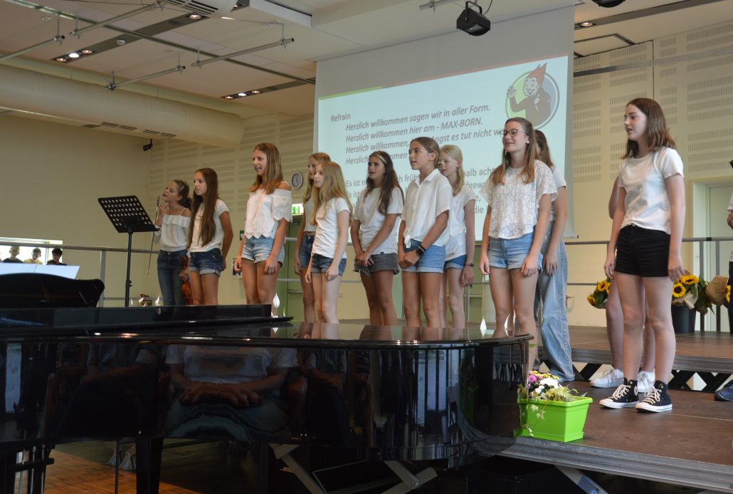 Die Schüler:innen der Singklasse 7a unter der Leitung ihrer Musiklehererin Sabine Krings begrüßten in der bis auf den letzten Platz gefüllten Aula des Schulzentrums 114 neue Fünftklässler mit ihren Eltern, Geschwistern und ihren neuen Lehrer:innen mit einem „Herzlich willkommen hier am -MBG!“