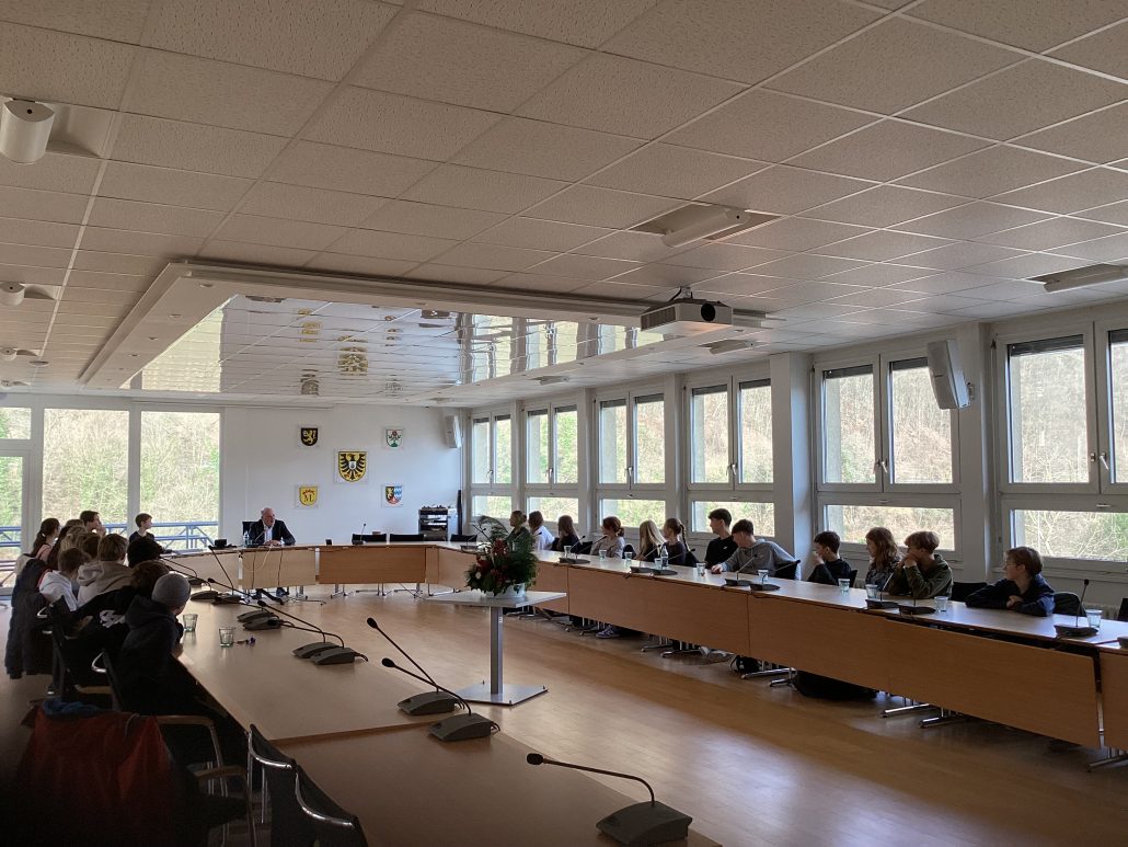 Am 25.01.2024 hat­ten wir, die Schüler:innen der Klas­se 8c des Max-Born-Gym­na­si­ums Neckar­ge­münd, die Mög­lich­keit, den Bür­ger­meis­ter Herrn Volk zu tref­fen. Das Tref­fen fand im Gemein­de­rats­saal statt und war äußerst auf­schluss­reich und inter­es­sant.