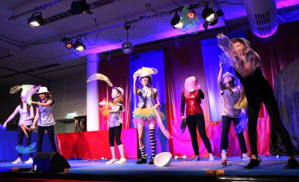 Ein­rad-Kön­ner roll­ten am Publi­kum rasant vor­bei. Wäh­rend auf der Büh­ne aus dem Hut (David Kes­ter­nich) gezau­bert wur­de, zog im Gang der Aula gekonn­te Boden­akro­ba­tik die Bli­cke auf sich und auch zwei Rhön­rä­der setz­ten sich ein­drucks­voll in Bewe­gung – da war wirk­lich ganz viel los und die Zuschau­er reck­ten ihre Köp­fe mal hier­hin, mal dahin.