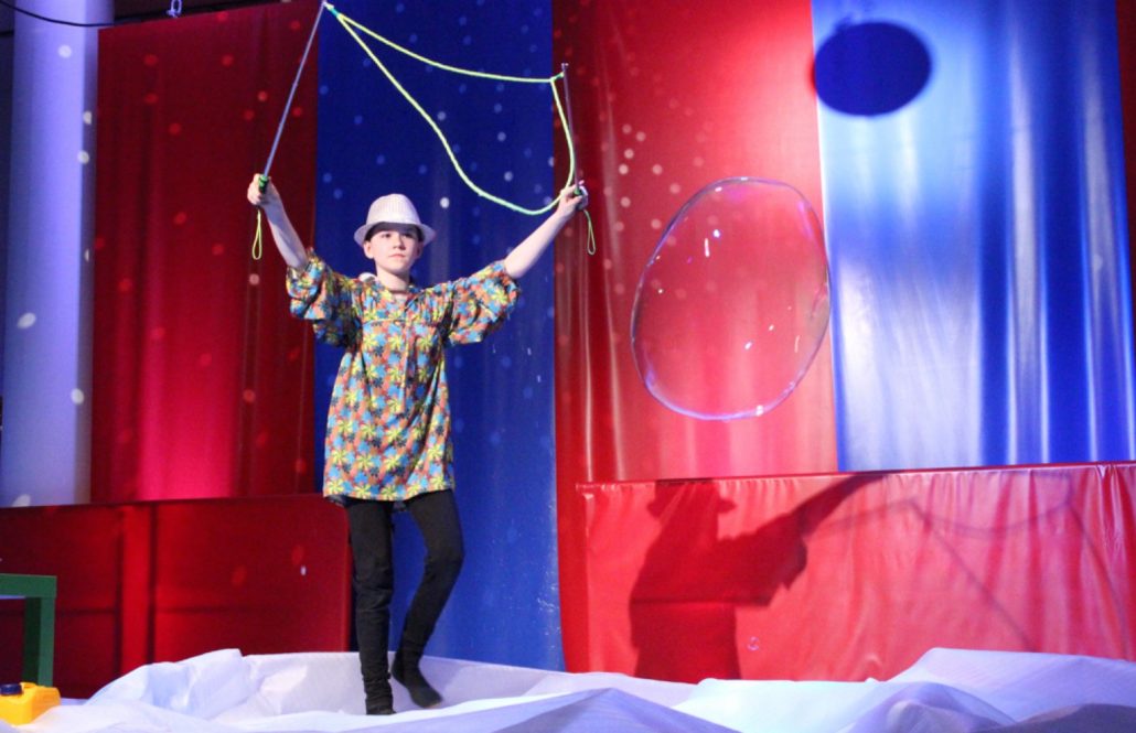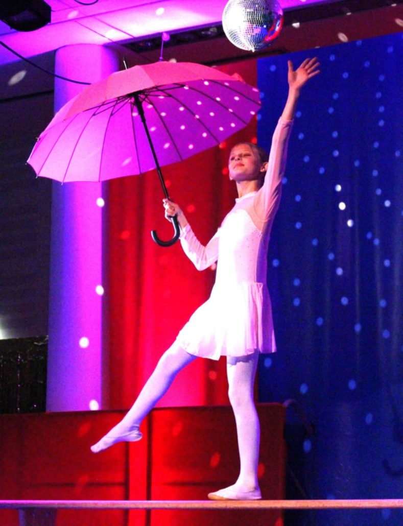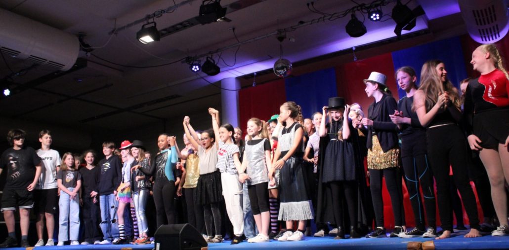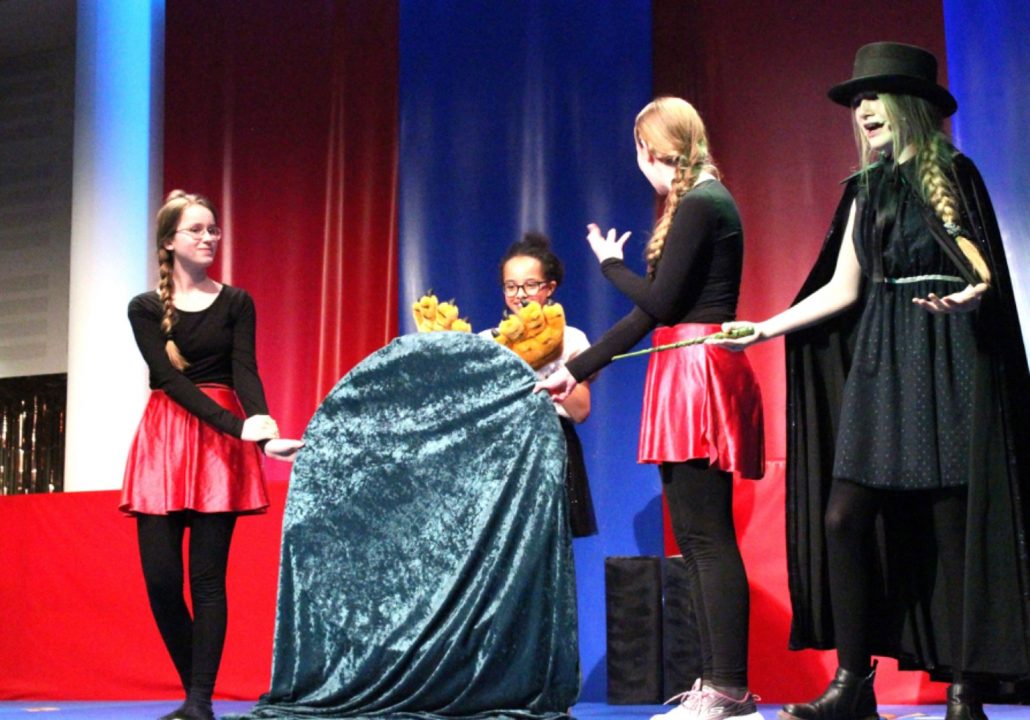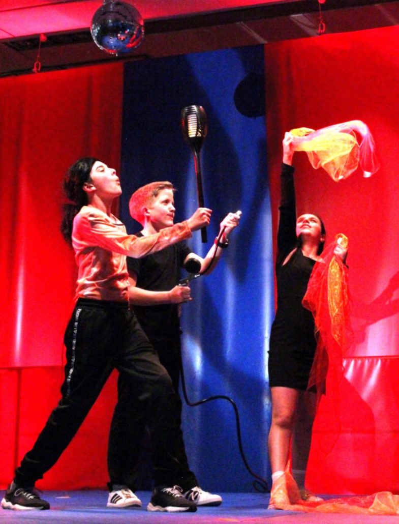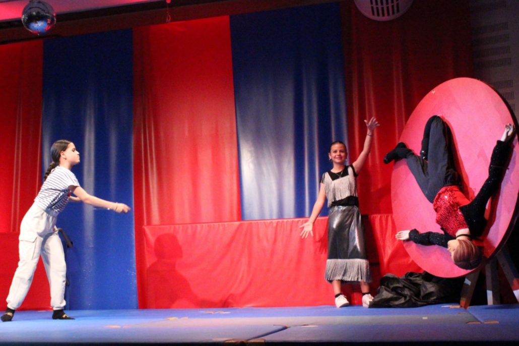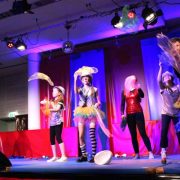 Den Zuschau­ern bot sich auf der Büh­ne ein herr­lich bun­tes Bild: Rote und blaue Zelt­bah­nen schmück­ten die mit Turn­mat­ten aus­ge­leg­te Büh­nen-Mane­ge, fan­ta­sie­vol­le Kos­tü­me und geschmink­te Gesich­ter ver­brei­te­ten Zir­kus­stim­mung genau­so wie Pop­korn, Zucker­stan­gen und Lut­scher, die ver­kauft wur­den. Mit dem Lied „Her­ein­spa­ziert, her­ein­spa­ziert in unser Zir­kus­zelt“ stimm­te der Kin­der­chor auf ein furio­ses Zir­kus­er­leb­nis ein und das war es in der Tat. Zir­kus­di­rek­tor Leo Pim­pel­mo­ser, gespielt von Ida Sus­ke (Vero­ni­ka Sitz­ler) war sei­ne Assis­ten­tin Bel­la Stel­la (Lucie Kusch) abhan­den gekom­men. Dafür beglei­te­ten die wit­zi­gen Clowns Coco (Amé­lie Gál/Mila Wag­ner) und Char­lie (Man­da­na Mohammadi/Mia Linier) sei­ne Pro­gramm­an­sa­ge. Doch ein gro­ßes Pro­blem trat auf: Die Bären­num­mer stand auf der Kip­pe, denn der Bär war wegen einer Maus­be­geg­nung vor Schreck aus sei­ner Haut gefah­ren und der Pro­gramm­ab­lauf muss­te umge­stellt wer­den. „Der Bär ist nackt…!“ hieß fol­ge­rich­tig der nächs­te Song. Mit „Hop­pa-di-hop­pa-di-hop­pa-di-ho“ tän­zel­ten eigens aus der Mon­go­lei impor­tier­te wil­de Zir­kus­pfer­de als Dschin­gis Khan und sei­ne Brü­der über die Büh­ne. Fakir Fan­fa­lo (Han­nah Karch) fas­zi­nier­te mit sei­ner Num­mer auf dem Nagel­brett. „Das muss doch pie­ken, pie­ken, pie­ken, furcht­bar pie­ken!“ sang der Chor ent­setzt. Grä­fin Cosi­mo (Laris­sa Blatt­mann) erwies sich als Spe­zia­lis­tin im Bauch­re­den mit ihrer Giraf­fe. Zum Song „Gra­zio­sa, Gra­zio­sa, dort schwebt ein Traum“ beweg­te sich Mia Schmitt anmu­tig als Seil­tän­ze­rin über ihr Gerät. Sil­ber­ne Mes­ser blitz­ten, als „Mes­ser­wer­fer Jack“ (Ama­lia Nina Peschke/Friederike Rein­hardt) und sei­ne bezau­bern­de Assis­ten­tin Lady Peaky (Cata­li­na Ven­ja­kob Monsalve/Milva Lin­gen­höhl) ihren gro­ßen Auf­tritt hat­ten. „Doch ver­letzt hat er sie nicht!“ ver­kün­de­ten die Chor-Kin­der erleich­tert. Die hei­ße Vor­stel­lung des Feu­er­spu­ckers Signor Vul­ca­no (Max Bra­ner), der Feu­er­tü­cher dank Luft­ma­schi­ne durch die Luft wir­beln ließ, insze­nier­te eine per­fek­te Illu­si­on. Der Sei­fen­bla­sen­künst­ler Mer­li­no (Cla­ra Gün­ther) ließ rie­sen­gro­ße Sei­fen­bla­sen ent­ste­hen und bezau­ber­te. Mit Hin­der­nis­sen gelang das auch Dr. Magi­cus (Ame­ly Thom­sen). Anstatt sei­ne Assis­ten­tin Madame Sulei­ka (Malia Deu­yo ) weg­zu­zau­bern, ver­pass­te er ihr abwech­selnd Schwei­neoh­ren, Tiger­kral­len und Ele­fan­ten­fü­ßen. Furi­os ging es mit einer Artis­ten­num­mer auf der Büh­ne wei­ter mit dem Auf­tritt von Umber­to Bal­la Bal­la (Jan Rich­ter) und sei­nen Assis­ten­tin­nen: Bäl­le wur­den jon­gliert, rasant Dia­bo­los gewor­fen und Swin­ging Pois gewir­belt.