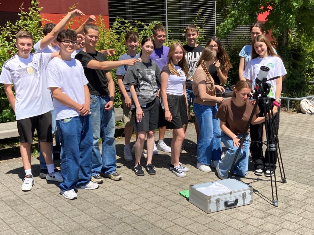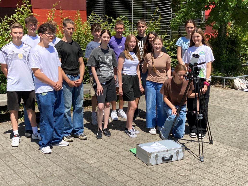 Am vergangenen Dienstag hatte unsere Kl.9, Gruppe2 im NWT Unterricht an einem strahlend klaren Tag die Möglichkeit einer Sonnenbeobachtung mit einem sog. H-Teleskop, – eine willkommene Abwechslung zum normalen Unterrichtsalltag.