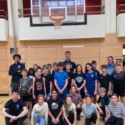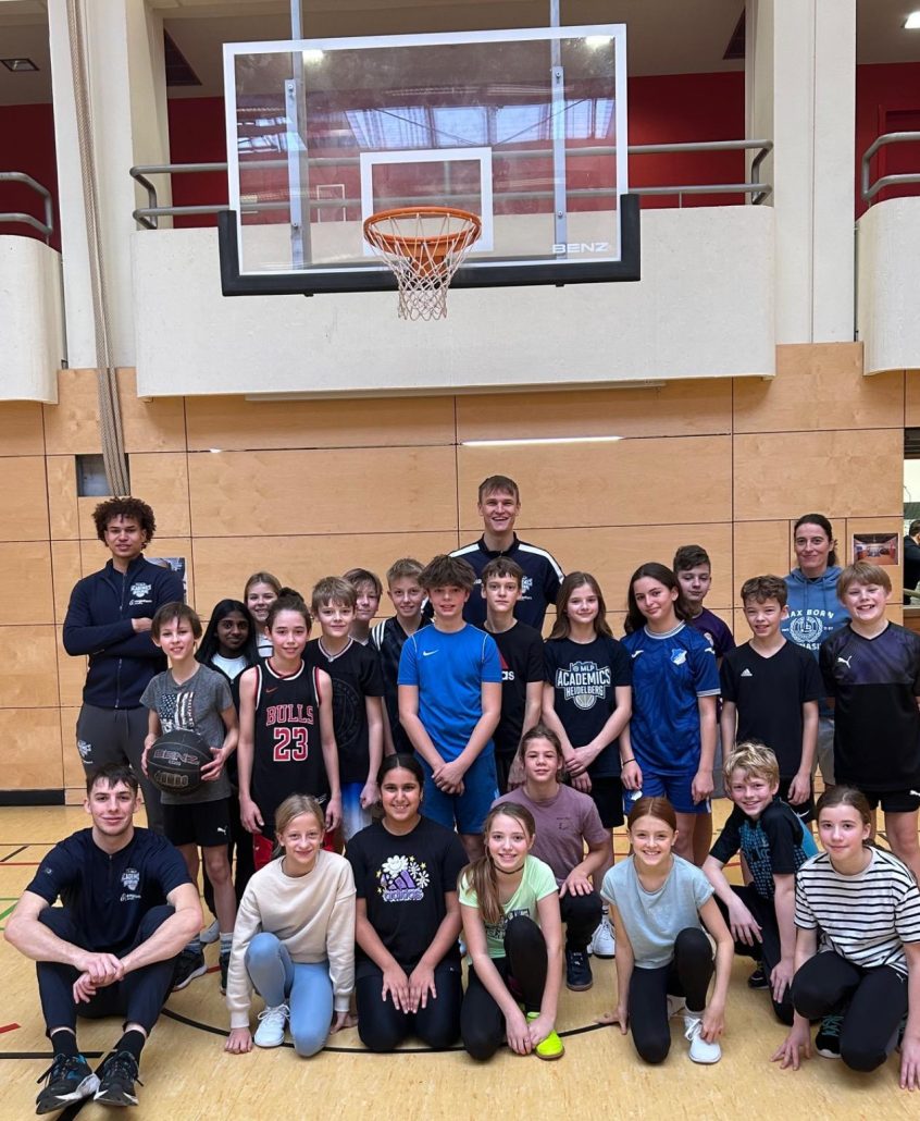 Einen besonderen Besuch erwartete die Klasse 6b am Dienstag vor Weihnachten in der Sporthalle: Drei Profis der MLP Academics Heidelberg wurden mit Spannung erwartet, um den Kindern eine besondere Basketballstunde zu bescheren. Um kurz vor 10 Uhr betraten Niklas Würzner (#2), Andrew O´Brien (#3) und Josia Gentischer (#6) die Sporthalle und legten nach einer kurzen Begrüßung gleich mit anspruchsvollen Dribbelübungen los, bei denen die 6b schnell ins Schwitzen kam. Sogleich folgte eine Technikeinheit zum Korbleger von rechts und von links, welche die 6b mit Bravour meisterte. Kleine Tricks durften geübt werden, und das Lob der Profis spornte die Schülerinnen und Schüler an, ihr Bestes zu geben. Anschließend lieferten sich zwei Gruppen bei verschiedenen Positionswürfen einen Teamwettkampf, der im 2:2 unentschieden endete. Auch das traditionelle Shoot Outdurfte zu guter Letzt nicht fehlen. Die Stimmung erreichte ihren Höhepunkt, als Josia und Andrew gegen die ganze Klasse auf zwei Körbe spielten, wobei die 6b alles gab und zeigen durfte, was sie konnte, nämlich Körbe machen im Team! Josia glänzte mit einem Dreier, Andrew punktete nah am Korb, aber die 6b konterte mit Korblegern und 2-Punkte-Würfen. Nach diesem spannenden Spiel durften die Kinder den Profis noch Fragen stellen und wollten natürlich auch einen Dunking sehen, den Andrew vorbildlich versenkte. Am Ende versuchte jeder noch ein Foto und ein oder mehrere Autogramme zu ergattern, manch einer ließ sich auch die Schuhe signieren. Glücklich und zufrieden verabschiedete sich die 6b von den Basketballern und bekam noch ein besonderes Weihnachtsgeschenk: einen kostenlosen Eintritt für ein Academics-Spiel im nächsten Halbjahr!