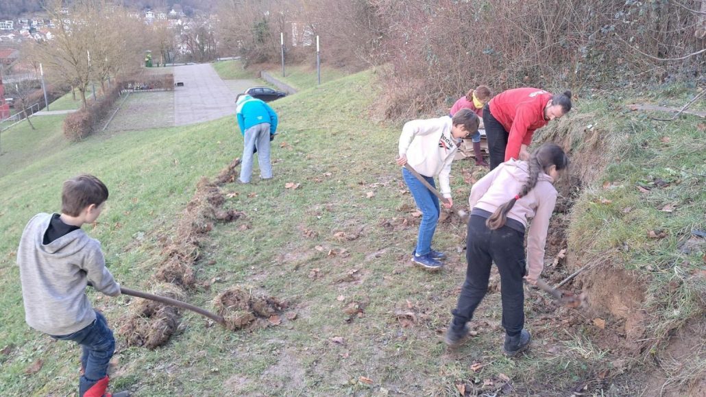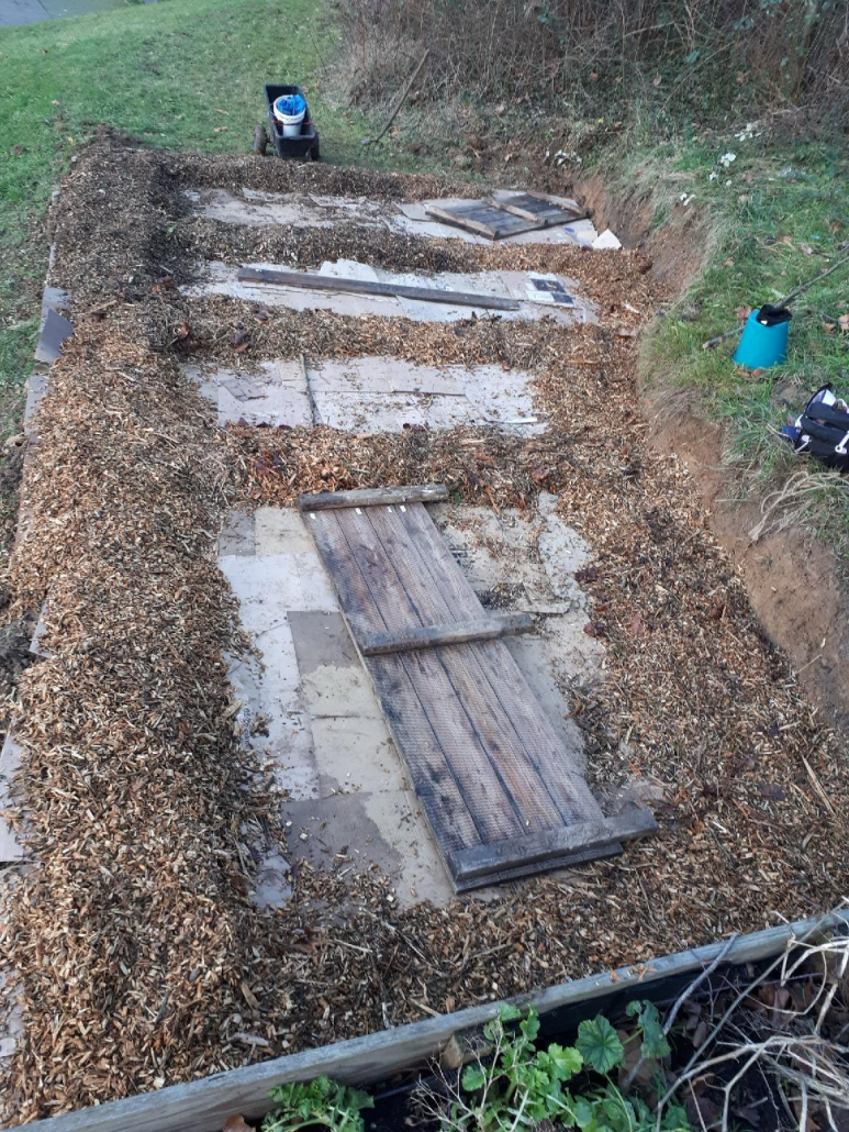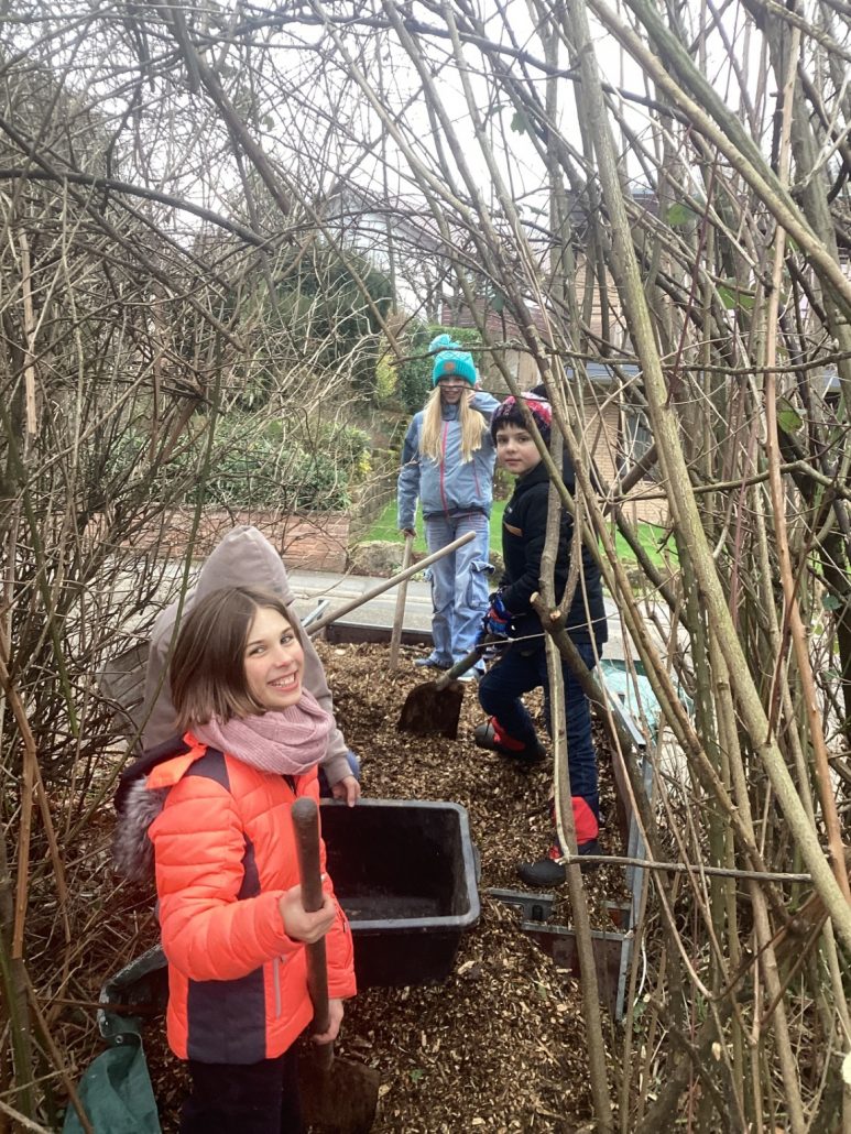 Anschließend mussten wir die Fläche der Beete vergrößern. Danach haben wir die plastikfreien Kartons auf der Fläche verteilt. Um die Kartons zu beschweren, haben wir mehrere Schubkarren Hackschnitzel (das sind dann die Wege) auf den Hügel geschleppt. Mit dieser „NO DIG“