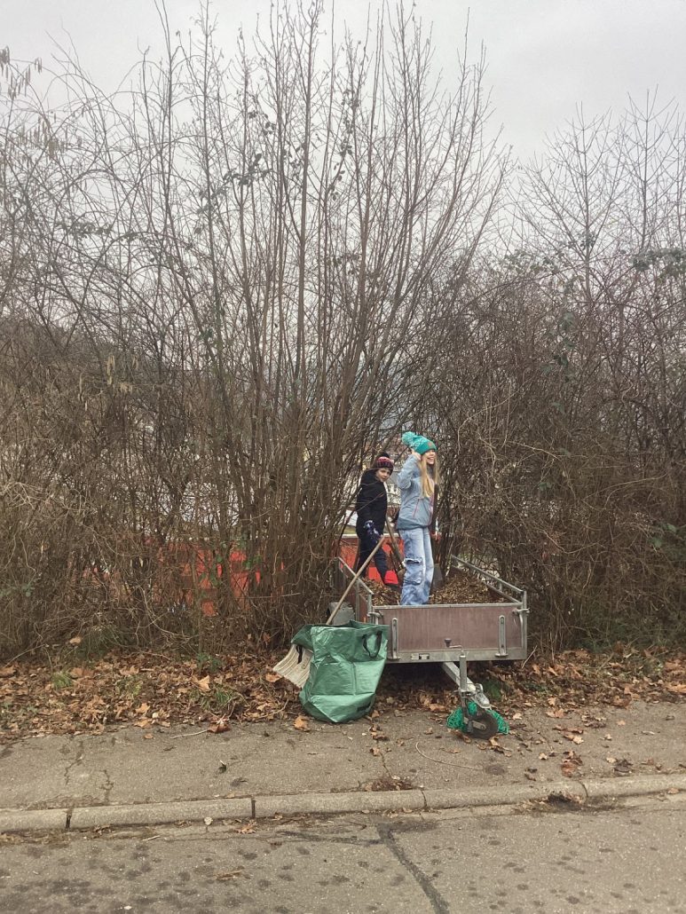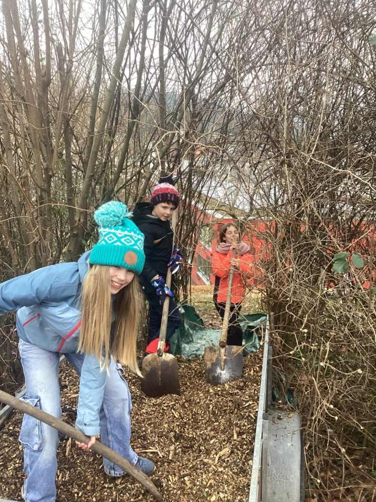 Lehrerparkplatz ist der zukünftige Schulgarten. Wir haben letztes Jahr mit der Vorbereitung des Beetes angefangen, indem wir ein Bohnenprojekt starten werden.