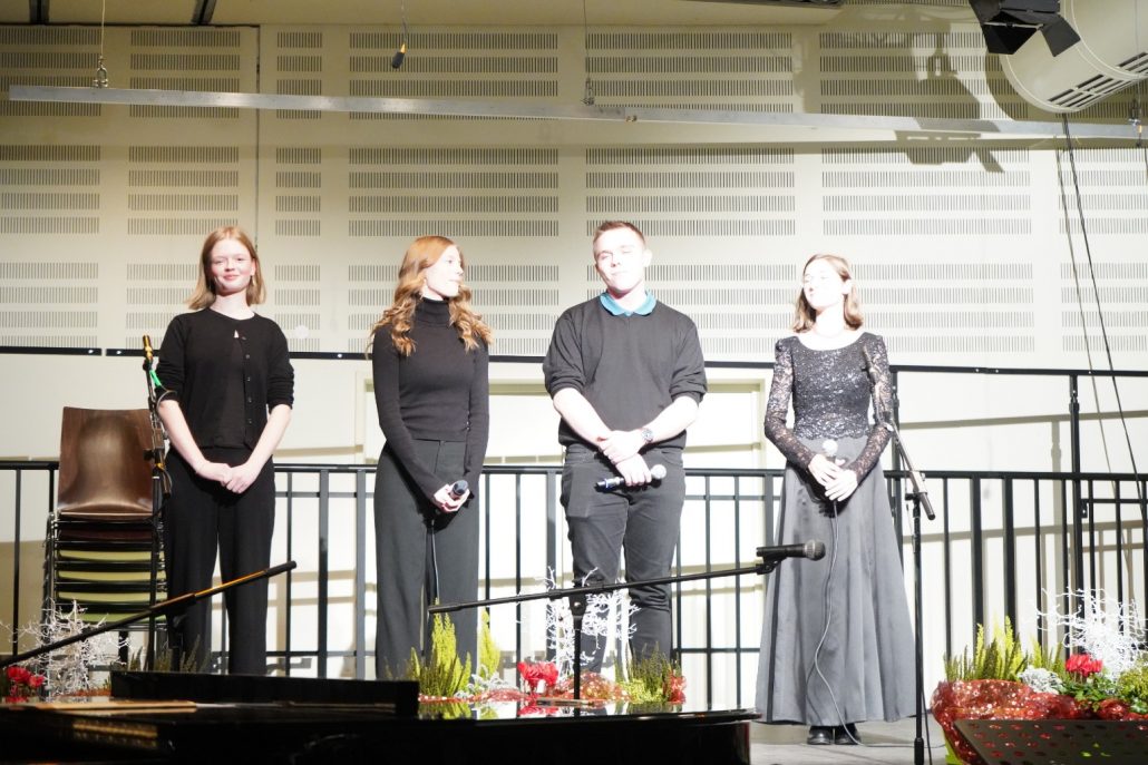 Weiter ging es mit der Musical-AG samt Chor: Sie sorgten auf der Bühne mit ihren Liedern für Weihnachtsstimmung. Und vor dem inneren Auge konnte bei Erklingen von besagtem „Winter Wonderland“ durchaus eine verträumte Winterlandschaft erscheinen. Dem in nichts nach stand „Leise rieselt der Schnee“. Der Chor wurde instrumental begleitet. Indes glänzte Kimberley Van Venrooy mit dem Lied „Wonderful Dream“ von Melanie Thornton. Und das Duo Theresa Rondot sowie Kira Welker begeisterte mit dem Klassiker „The Sound of Silence“ von Paul Simon ebenfalls gesanglich. Im Laufe des Abends gab es zahlreiche Gänsehautmomente. Das instrumentale Ensemble „Wood & Brass“ etwa interpretierte „Jingle Bells“ und „We Wish You A Merry Christmas“. Und Max Braner spielte am Klavier „Silent Night“.